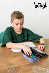 Praktische en duurzame schooletui van BAAGL met NASA-motief, biedt overzichtelijke opslag van schrijfbenodigdheden dankzij een uitklapbaar tussenschot, een binnenzak met rits en een vak voor het rooster. Gemaakt van gerecycled materiaal en uitgerust met hoogwaardige YKK-ritsen. Zonder vulling.