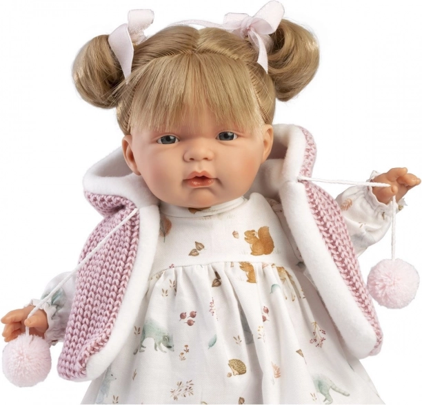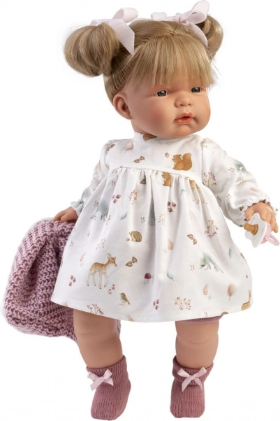 Huilpop Llorens Joelle 38 cm – handgemaakt in Spanje. Realistisch, van hoogwaardige materialen, huilt wanneer de speen wordt verwijderd. Kleding en speen inbegrepen.