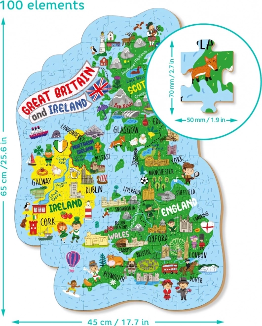 Ontdek de charme van de eilanden met een educatieve puzzel die op een speelse manier de geografie van het Verenigd Koninkrijk en Noord-Ierland presenteert. Ideaal voor kinderen en volwassenen, met beschrijvingen in het Engels voor taaltraining en het uitbreiden van kennis. De puzzel meet na het leggen ongeveer 65 × 45 cm en bevat 100 stukjes voor ontspannen gezinsplezier.