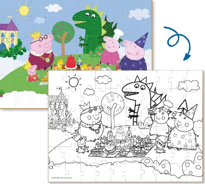 Deze dubbelzijdige puzzel bezorgt kinderen dubbel zoveel plezier. Eerst leggen ze een vrolijke afbeelding met de geliefde personages uit de wereld van Peppa Pig, daarna kunnen ze de andere, zwart-witte zijde na het voltooien naar eigen fantasie inkleuren. De gelegde afbeelding is ongeveer 32 × 23 cm groot en past zo gemakkelijk op een kindertafeltje.