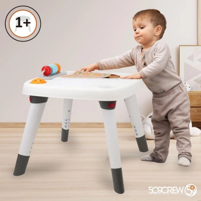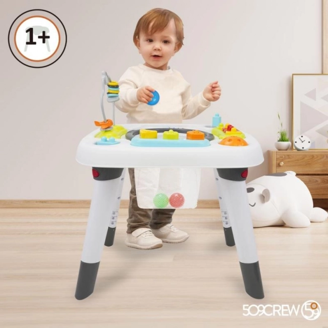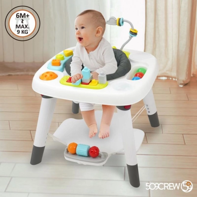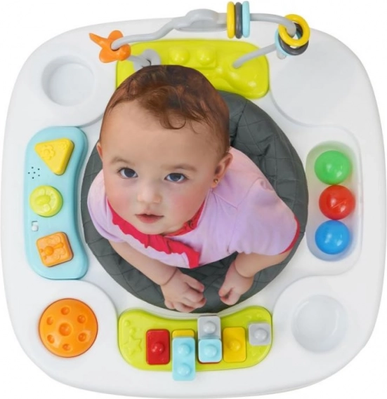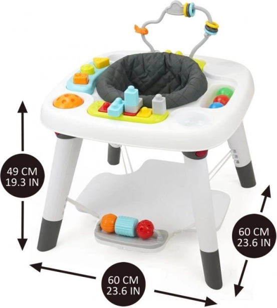 De Interactieve Speeltafel voor Kinderen 3-in-1 is meer dan alleen speelgoed. In de eerste fase kan een kind de wereld om hen heen verkennen vanuit een comfortabele stoel met speelgoedjes die makkelijk bereikbaar zijn. De tweede fase biedt plezier tijdens het leren lopen en communiceren met interactieve en kleurrijke speeltjes die rond de tafel zijn geplaatst. De derde en laatste fase transformeert de tafel in een functioneel meubelstuk dat kan dienen voor spel, eten of andere creatieve activiteiten.