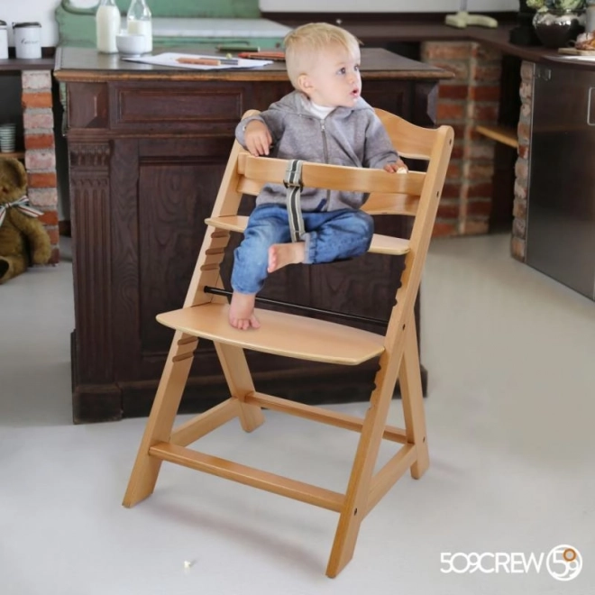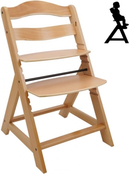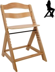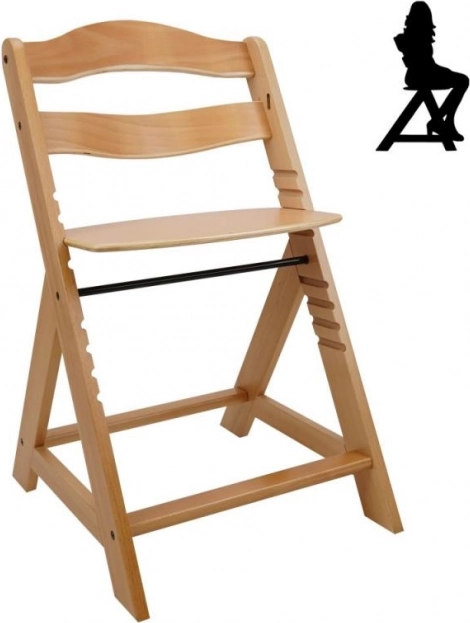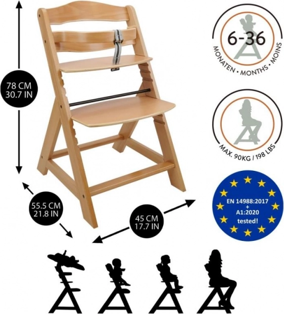 De houten meegroeistoel is ontworpen voor maximaal comfort en veiligheid voor kinderen vanaf zes maanden. Voorzien van een meertrapsverstelling van de zithoogte en voetsteun, kan het vanaf jonge leeftijd tot volwassenheid worden gebruikt. Bij bereiking van de oudere leeftijd kunnen de voorste stang en de split in het kruis worden verwijderd en kan de stoel worden omgezet in een normale stoel. Gemaakt van hoogwaardig Duits beukenhout en biedt stabiliteit en elegantie. De maximale draagkracht is tot 90 kg.