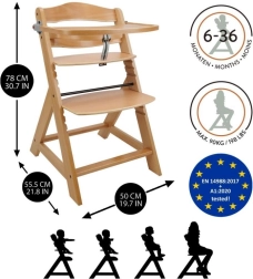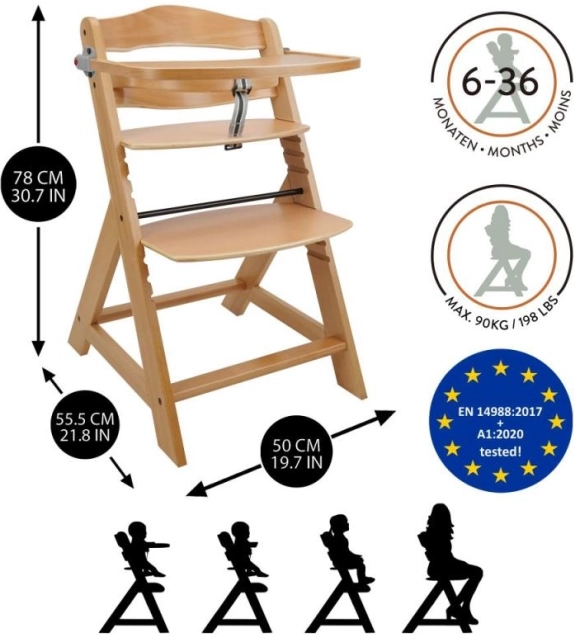 Aanbevolen leeftijd: voor kinderen vanaf 6 maanden. Maximaal draagvermogen 90 kg. Het product voldoet aan norm EN14988. Gemaakt van hoogwaardig Duits beukenhout.