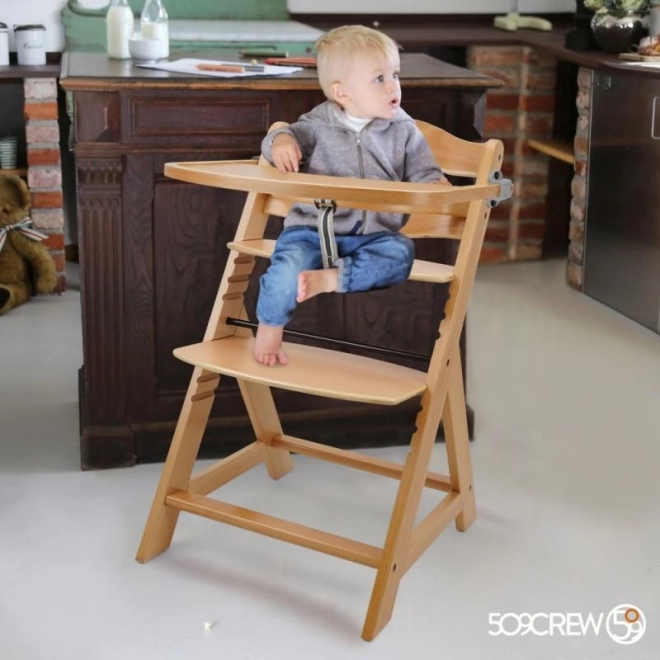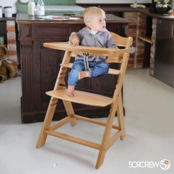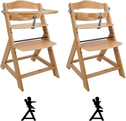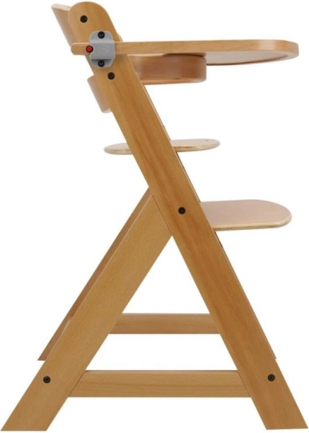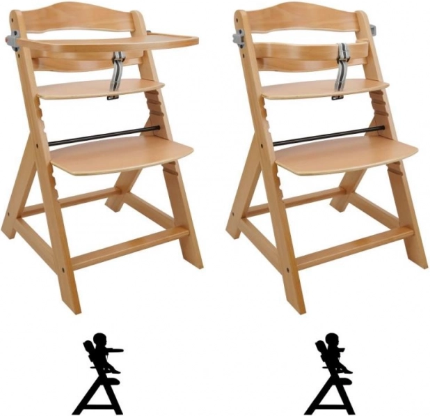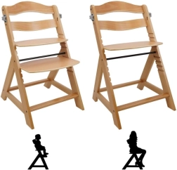 Houten kinderstoel die meegroeit met het kind. Inclusief houten voorblad, voorstang en kruisriem – bij oudere kinderen afneembaar en om te bouwen tot een normale stoel, ook voor volwassenen. Meervoudige hoogteverstelling van zitting en voetensteun. De voetensteun kan volledig worden verwijderd.