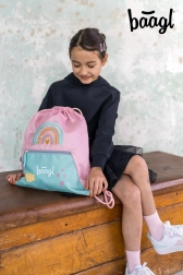 Praktische schoolzak van BAAGL voor schoenen en vrijetijdsactiviteiten in een elegant roze Regenboog-design. Biedt een stevig, afwasbaar materiaal, een praktisch ritsvak aan de onderzijde en sluiting met stevige koorden, waardoor hij comfortabel op de rug te dragen is. Dankzij de karabijnhaak bevestig je hem eenvoudig aan een boekentas.