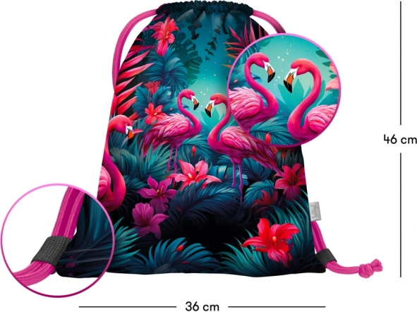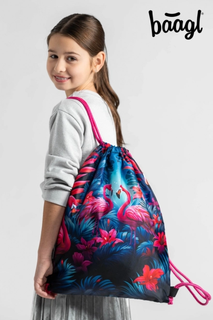 Stijlvolle zak met flamingo-motief van Baagl, ideaal voor schoenen en kleine spullen voor vrijetijdsactiviteiten. Biedt een stevig, afwasbaar materiaal, een praktische karabijnhaak om aan een schooltas te bevestigen en sluiting met stevige koorden, waardoor hij comfortabel als rugzak te dragen is.