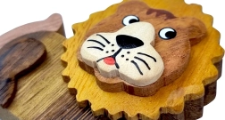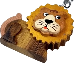 Deze handgemaakt houten sleutelhanger in de vorm van een leeuw wordt een sieraad voor je sleutels, handtassen of rugzakken. Het product is vervaardigd uit vijf soorten natuurlijk hout: gele broodboom, lichtbruine tamarinde, donkerbruine kassie, roze aniba en witte gmelina arborea. Het hout is niet geverfd, maar in zijn natuurlijke staat gelaten en het totale design is afgewerkt met handschildering.