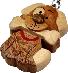 De sleutelhanger is vervaardigd uit vijf soorten natuurlijk hout, waaronder geel broodvruchthout, lichtbruin tamarindehout en andere, die zorgen voor natuurlijke kleurtonen.