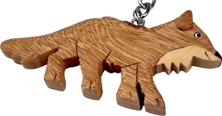 Deze grote vossensleutelhanger is met de hand gemaakt van tot wel vijf soorten natuurlijk hout met een van nature uiteenlopende tekening. Het hout is niet geverfd, slechts subtiel met de hand bijgewerkt om details te accentueren – zo ontstaat een unieke hanger die op sleutels en rugzakken echt opvalt.