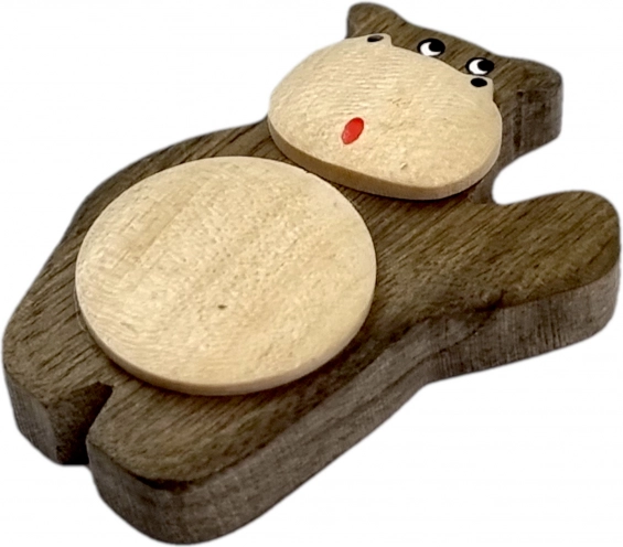 De originele houten nijlpaardmagneet is gemaakt van een combinatie van wel vijf houtsoorten met een natuurlijk verschillende kleur, waardoor hij authentiek en warm oogt. Het hout is niet geverfd – alleen met de hand bijgewerkt om details te accentueren. De sterke magneet houdt betrouwbaar op de koelkast, afzuigkap en magnetisch bord.