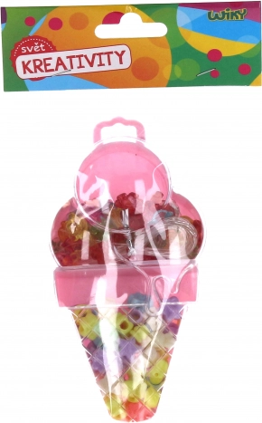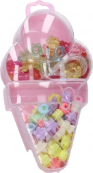 Ontdek de leuke kralenset in de vorm van een ijsje, met kralen in verschillende maten en kleuren, plus een koord voor makkelijk rijgen.
