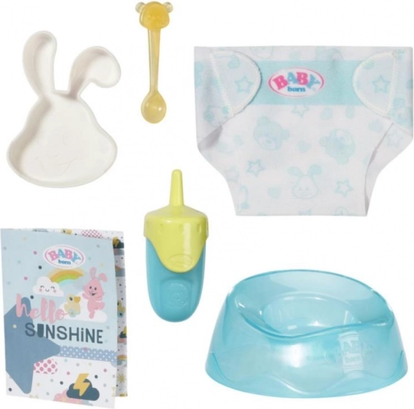 De set bevat een flesje, speen, speen met lint, luiers en andere accessoires voor volledige zorg en spelen.
