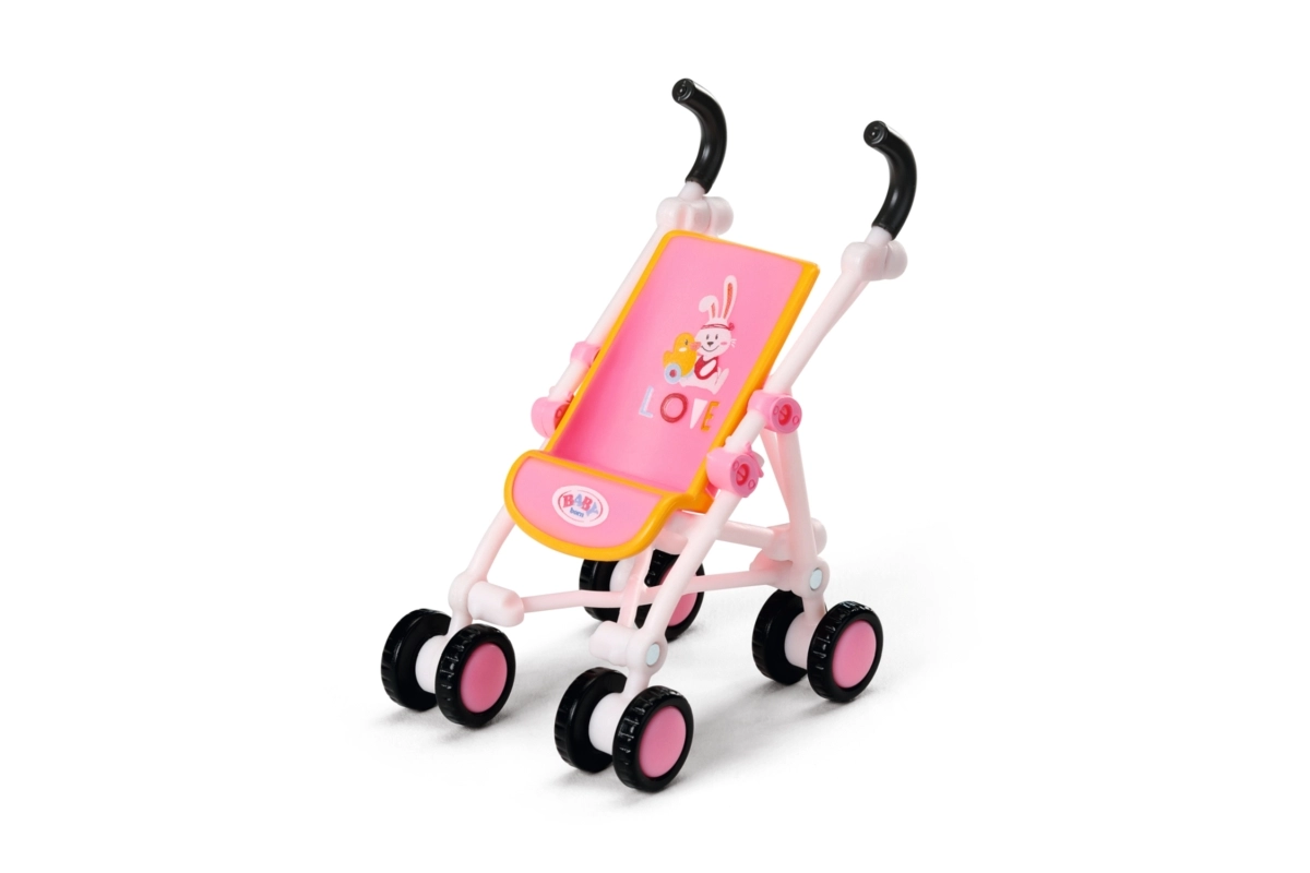 Stabiele kunststof kinderwagen met dubbele wieltjes, eenvoudig te besturen en ideaal voor het vervoeren van poppen en knuffels.