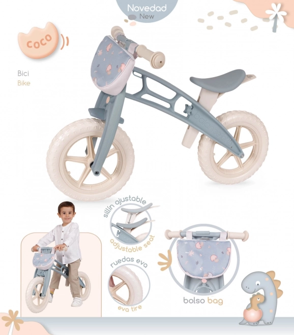 De COCO-loopfiets is het ideale eerste fietsje voor kinderen vanaf 3 jaar. Dankzij het lage gewicht van 2 kg is hij eenvoudig te besturen, vergroot hij het vertrouwen tijdens het rijden en bereidt hij je kind voor op een soepele overstap naar een fiets met trappers. Het design met een schattig dinosaurusmotief combineert Spaanse stijl met oog voor detail.