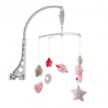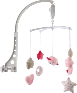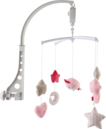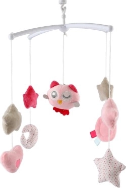 De roze muziek-mobiel met uiltje brengt rust en een gevoel van veiligheid voor baby’s. De zachte hangende elementen in de vorm van sterretjes, hartjes en een maantje bewegen zachtjes heen en weer, terwijl het mechanische opwindwerk een prettige melodie afspeelt. De stille werking en de visueel vriendelijke pastelkleuren ondersteunen een kalmerende sfeer voor het slapengaan.