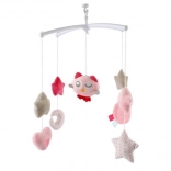 Stel je baby gerust met de zachte beweging en melodie van deze roze wiegmobiel met uiltje. Dankzij de opwindbare muziekdoos en de zachte hangfiguren (sterren, hartjes, maantje) helpt hij kinderen te vermaken en in slaap te sussen. Eenvoudige montage aan het ledikant en zachte pastelkleuren passen in iedere kinderkamer.