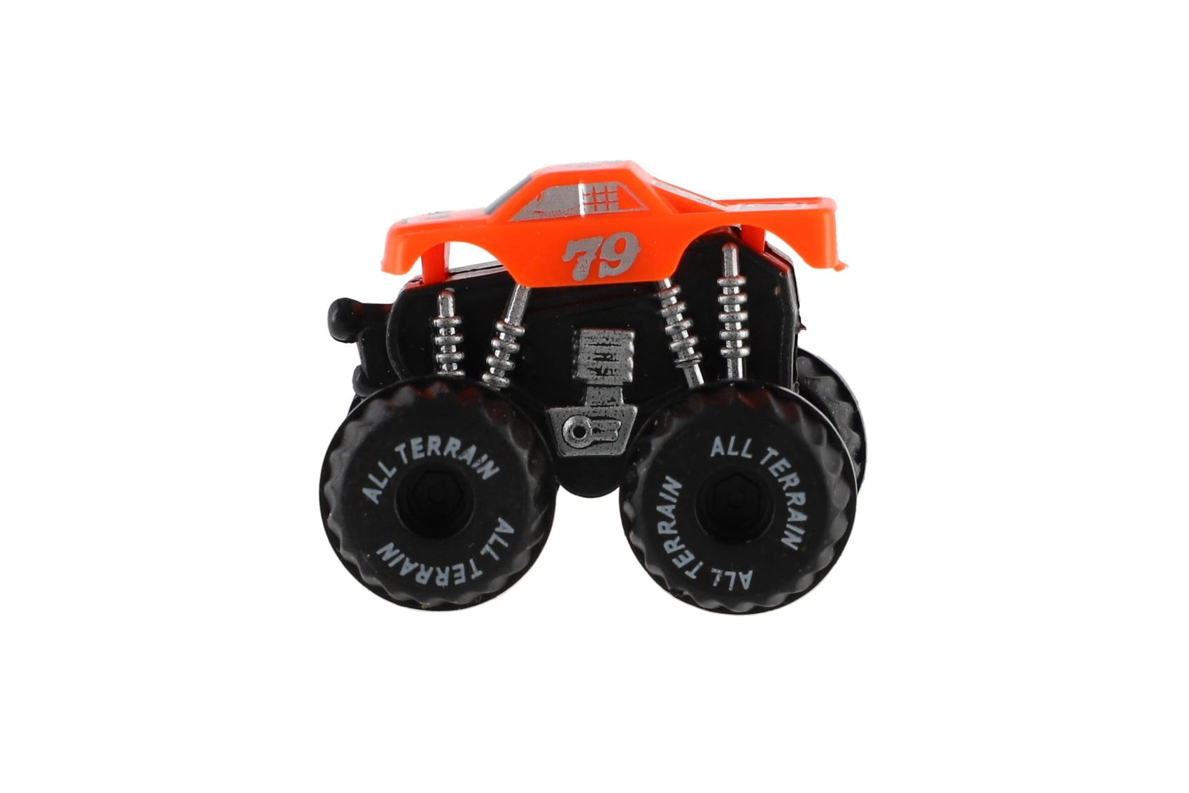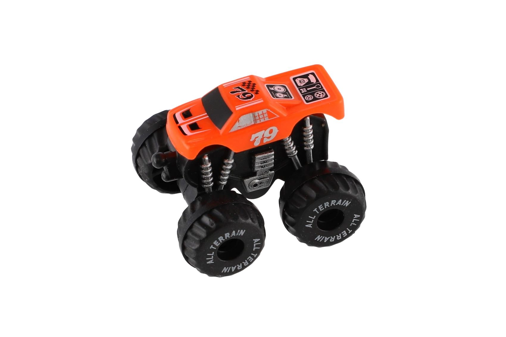 Het autootje is verkrijgbaar in 3 kleuren (oranje, blauw, rood) met race‑details en nummers (bijv. 79, 65). Grote terreinwielen met grof profiel en zichtbare veerdetails benadrukken de off‑road stijl. Geweldig voor de ontwikkeling van fijne motoriek, coördinatie en competitief spel.