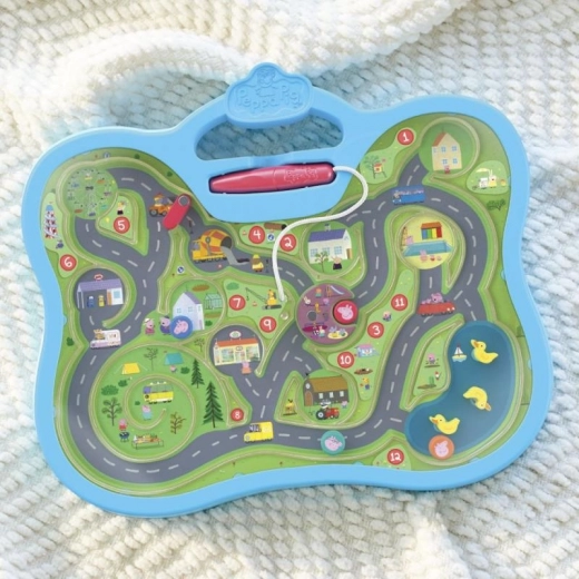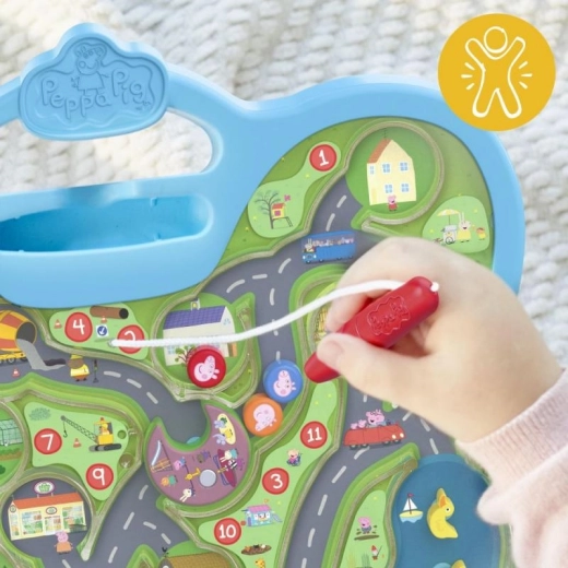 De stabiele plaat met geïntegreerde handgreep en stevig bevestigde stylus is perfect voor thuis en onderweg. Genummerde haltes ondersteunen het leren van cijfers en sequenties, terwijl de kleurrijke illustraties van favoriete plekken uit de Peppa Pig-verhalen de aandacht vasthouden en motiveren om verder te ontdekken.