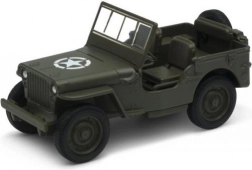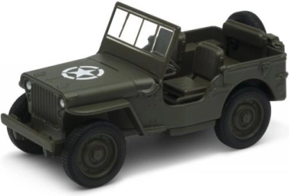 Bekijk het realistische model van een rijdend voertuig in olijfgroene kleur, compleet met een herkenbaar symbool in de vorm van een witte ster.