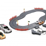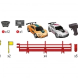 In de verpakking vind je alles voor direct racen: 2 racewagens, 2 handcontrollers en praktisch toebehoren. Dankzij het compacte formaat van 90 × 65 cm past de racebaan op een tafel of in de kinderkamer.