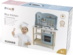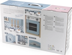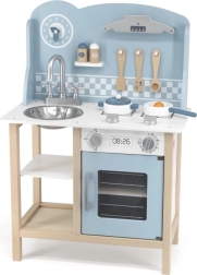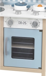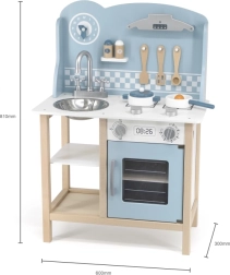 Het doordachte houten keukentje in pooltinten combineert tijdloos design met hoogwaardige afwerking. Kinderen vinden er alles wat ze uit een echte keuken kennen – gootsteen, oven, kookplaat en afzuigkap – plus een praktische opbergruimte met plank voor etenswaren en servies. Het oppervlak is gelakt met niet-giftige, veilige verven en alle randen zijn glad voor veilig spelen.
