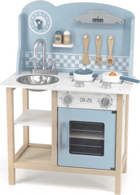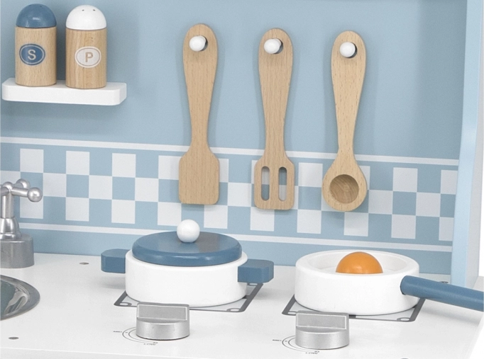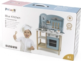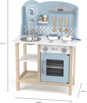 De stijlvolle kinderkeuken VIGA PolarB in het blauw biedt kleine chef-koks realistische speelpret voor uren. Bevat een gootsteen, oven, kookplaat en afzuigkap, rijk accessoirepakket en 4 draaiknopp... Meer tonen