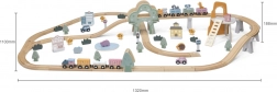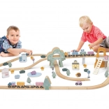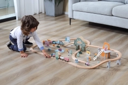 De uitgebreide set bevat rails, verhogingen, een brug, een treintje met wagonnetjes en veel accessoires. Kinderen passen de routes eenvoudig aan en verzinnen bij elk speelmoment nieuwe verhalen.
