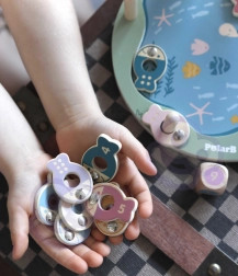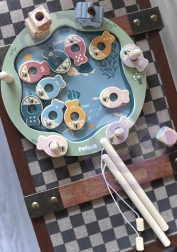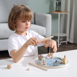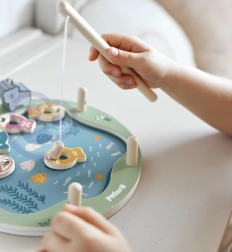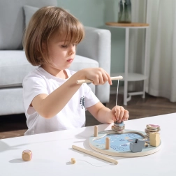 Het houten magnetische visspel is een uitstekende keuze voor de eerste gezelschapsspelletjes. Kleurrijke, genummerde visjes met stippen worden gevangen met magnetische hengels; zo oefenen kinderen op speelse wijze tellen, concentratie en geduld. De dobbelsteen voegt toeval en spanning toe – wie de juiste vis vangt, wint.
