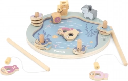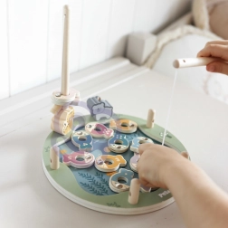 - Inhoud van de set: houten ondergrond, 2 magnetische hengels, dobbelsteen, 12 visjes met cijfers/stippen