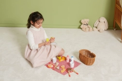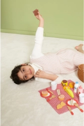 Ga op een leuke picknick met de kinderen dankzij de houten picknickset van VIGA. De stijlvolle rotan mand met geruite stof bevat 30 onderdelen, waaronder drankjes, eten en servies. Sommige etenswaren zijn met klittenband en kinderen kunnen ze snijden met het houten mes – een geweldige manier om de fijne motoriek te ontwikkelen en rollenspel te spelen, zowel binnen als buiten.
