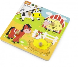 De duurzame houten plaat van circa 22 × 22 cm is rijk geïllustreerd met een boerderijmotief dat kinderen motiveert tot verder spelen en het uitbreiden van hun woordenschat (bijv. koe, schaap, paard, kip). De puzzel is geschikt vanaf 12 maanden en is dankzij het compacte formaat makkelijk op te bergen en mee te nemen.