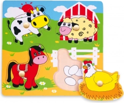 Deze kleurrijke houten inlegpuzzel met een boerderijthema biedt kinderen plezier in ontdekken en leren. Massieve stukjes met houten knopjes passen perfect in kleine handjes en ondersteunen een juiste greep. De stukjes worden in uitsparingen met bijpassende silhouetten gelegd, wat het logisch denken en het herkennen van vormen stimuleert.