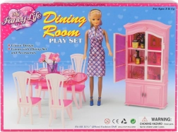 De set bestaat uit een grote tafel, vier stoelen, een buffetkast en complete tafelaccessoires. Alles is gemaakt van duurzaam kunststof en ontworpen voor eenvoudige bediening door kinderhanden.