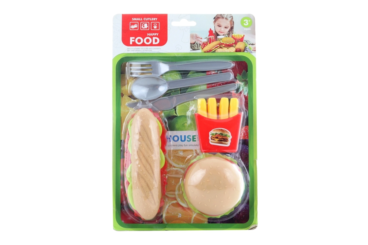 Met deze realistische set van plastic voedsel beleven kinderen urenlang creatieve pret. De set bevat favorieten zoals een baguette, hamburger en frietjes in een doosje, aangevuld met bestek. Een geweldige keuze voor kinderkookhoekjes, winkeltjes en restaurantrollenspellen.