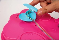 Het roze werkraam met vakjes houdt koordjes en kralen overzichtelijk op hun plek en de groef helpt de draden te geleiden tijdens het weven.