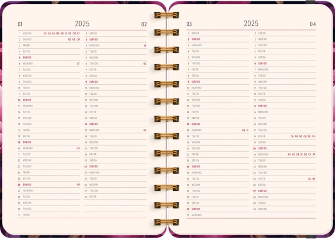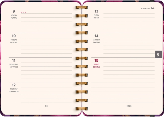 Dankzij het compacte formaat van 13 × 18 cm past de agenda gemakkelijk in je handtas of rugzak, terwijl de spiraalbinding zorgt voor comfortabel volledig openklappen en prettig schrijven. Overzichten voor 2024 en 2025 en gemarkeerde feestdagen verhogen het gemak van oriënteren en plannen.