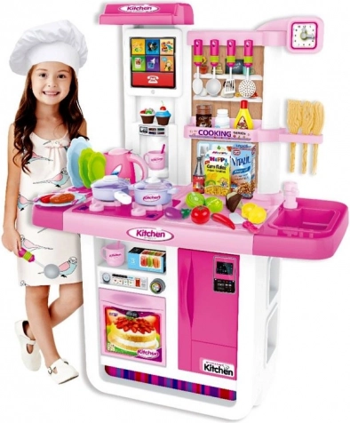 Prikkel de fantasie en vaardigheden van je kind met deze interactieve kinderkeuken in roze-witte kleur. Hij biedt licht- en geluidseffecten, een functioneel touchpanel, stromend water in de gootsteen, een koelkast, een oven en volop accessoires, waaronder voedsel met klittenband. Ideaal voor veilig kookspel en het aanleren van huishoudelijke taken.