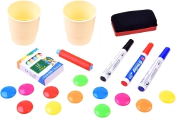 In de verpakking zitten magneten, droog uitwisbare stiften met wisser, kleurkrijtjes, een krijthouder en een plankje voor benodigdheden.