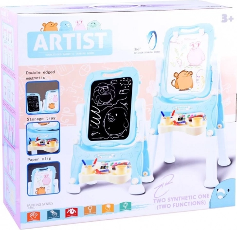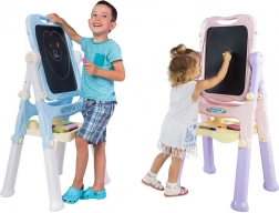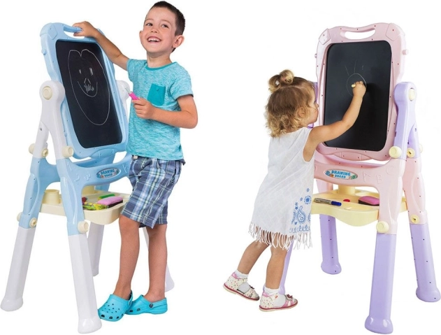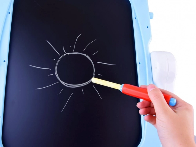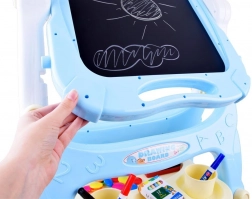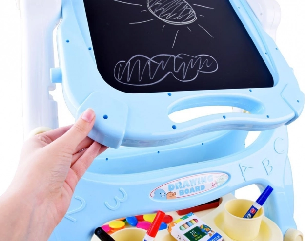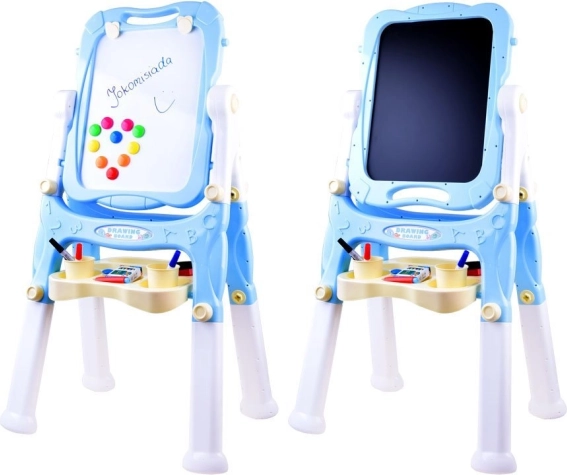 Dit stabiele schilderbord met pastelblauwe rand stimuleert creativiteit en leren. Eén zijde is magnetisch voor droog uitwisbare stiften en het bevestigen van magneten of papier, de andere zijde is klassiek zwart voor tekenen met kleurkrijt. Dankzij de praktische plank, bekers en houders heb je alle benodigdheden altijd bij de hand.