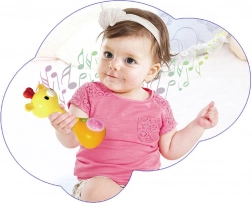 De interactieve rammelaar biedt meer dan alleen ritselen – hij laat kinderen luisteren naar vrolijke melodieën, korte geluiden (vogeltjes, kinderlach, veer) en toonspel bij het schudden. Het kleurrijk oplichtende buikje van het diertje trekt de aandacht en motiveert tot herhaald spelen.