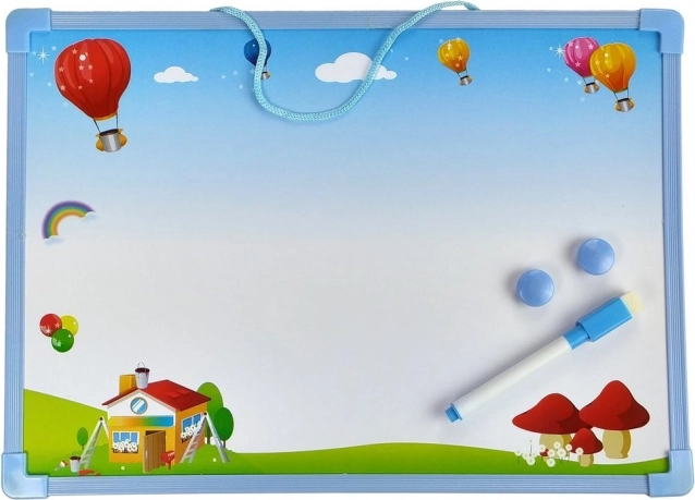 Onderdeel van de set is een dubbelzijdig bord met magneten en een uitwisbare stift, waarop kinderen ontwerpen kunnen plannen, vormen en kleuren oefenen en hun fijne motoriek ontwikkelen. Alles is opgeborgen in een decoratieve doos, wat het meenemen en opbergen vergemakkelijkt.