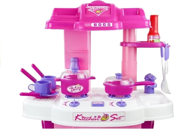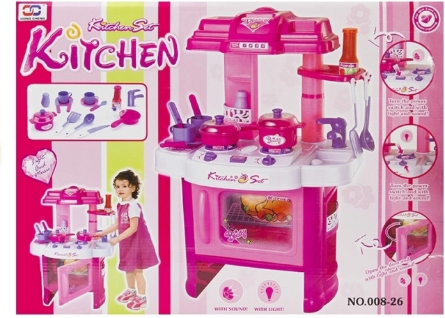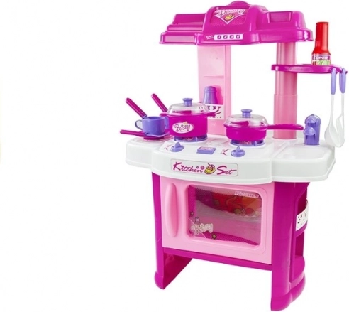 Dit roze-witte keukentje voor jonge chef-koks biedt realistische kookervaringen. Twee apart bedienbare kookplaten lichten op en worden begeleid door borrelgeluid, terwijl de oven met timer bij het inschakelen oplicht en na afloop automatisch uitschakelt. Kinderen kunnen zo veilig “echt” koken en bakken uitproberen.