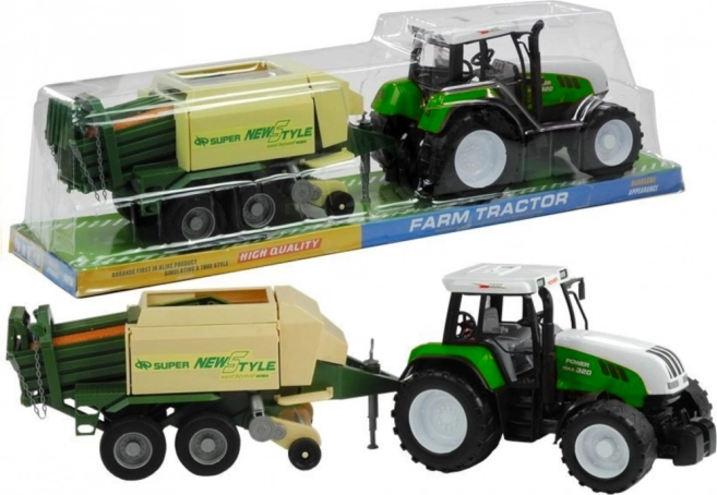 De aanhanger bevat bewegende onderdelen zoals een uittrekbare steun, een draaiende invoermechanisme en openende zij- en achterkleppen. Deze opwindende tractor is verkrijgbaar in rood en groen, wat bijdraagt aan de authenticiteit en het plezier.