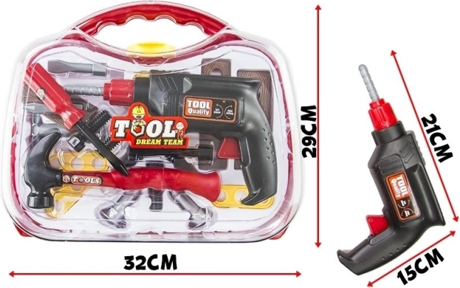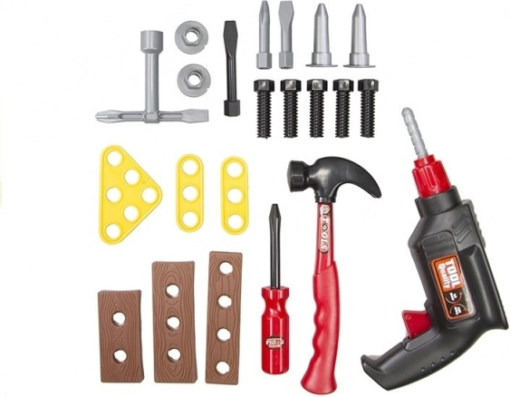 De set omvat een realistische speelgoedboor, een functionele schroevendraaier met verwisselbare bitjes, een hamertje, schroeven en drie plaatjes om montage te oefenen. Alles is gemaakt van licht, duurzaam kunststof dat veilig is voor kinderspel.