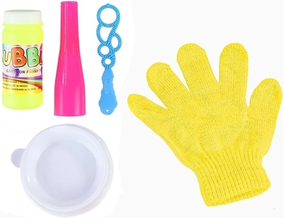 - Complete uitrusting: schaaltje voor de oplossing, roze trechter/buisje, blaastokje, fles met oplossing en één handschoen.