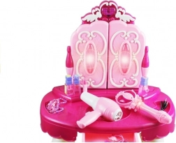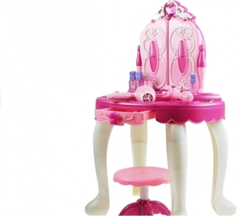Vervul de droom van kleine dametjes met deze magische kaptafel voor kinderen. Openende spiegels met een toverstok, lichteffecten, muziek, mogelijkheid tot MP3-aansluiting en een werkende kinderverdeler zorgen voor uren creatieve pret. De uitgebreide set met accessoires inclusief kam, flesjes en kralen stimuleert fantasie en de prinsessenrol.