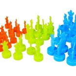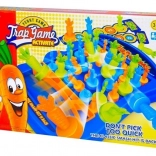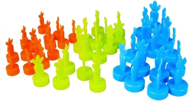 Het spel bevat kleurrijke plastic worteltjes in oranje, groen en blauw, die verschillende puntenwaarden vertegenwoordigen. Deze elementen zijn ideaal voor leuk en visueel aantrekkelijk spel.