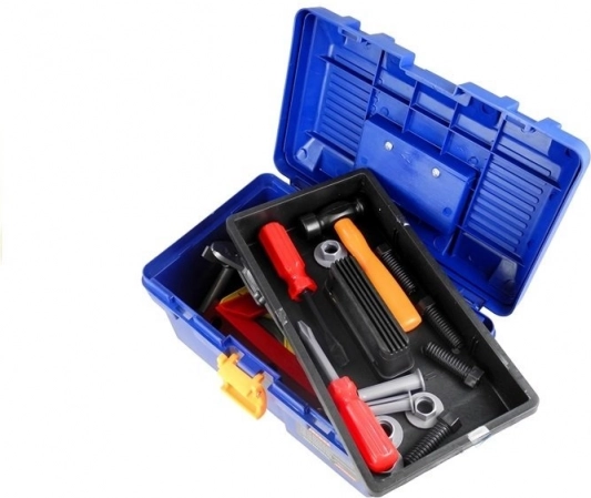 - koffertje, boor, hamer, handzaag, verstelbare moersleutel, ringsleutel, dopsleutel, platte sleutel, kruiskopschroevendraaier, platte schroevendraaier, bouten en moeren, schuifmaat, spatel, vijl, waterpas, hoeklijnen, verbindingsstukken met gaten