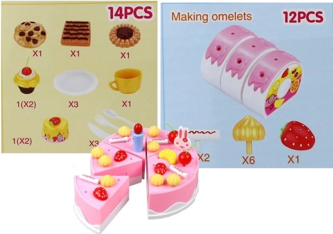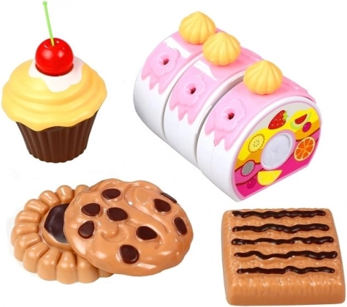 Cupcake, koekjes en een stukje rolcake maken elk kinderfeestje compleet. De onderdelen zijn kleurrijk en uitnodigend voor fantasierijk spel in de banketbakkerij.