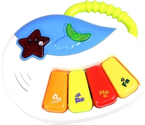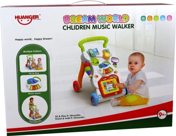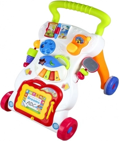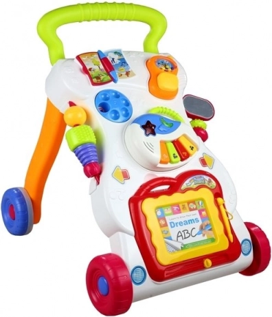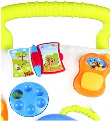 Een pianootje met melodieën, draaiwieltjes, een boekje en een telefoon–rammelaar stimuleren de zintuiglijke ontwikkeling en het leren van cijfers en vormen.